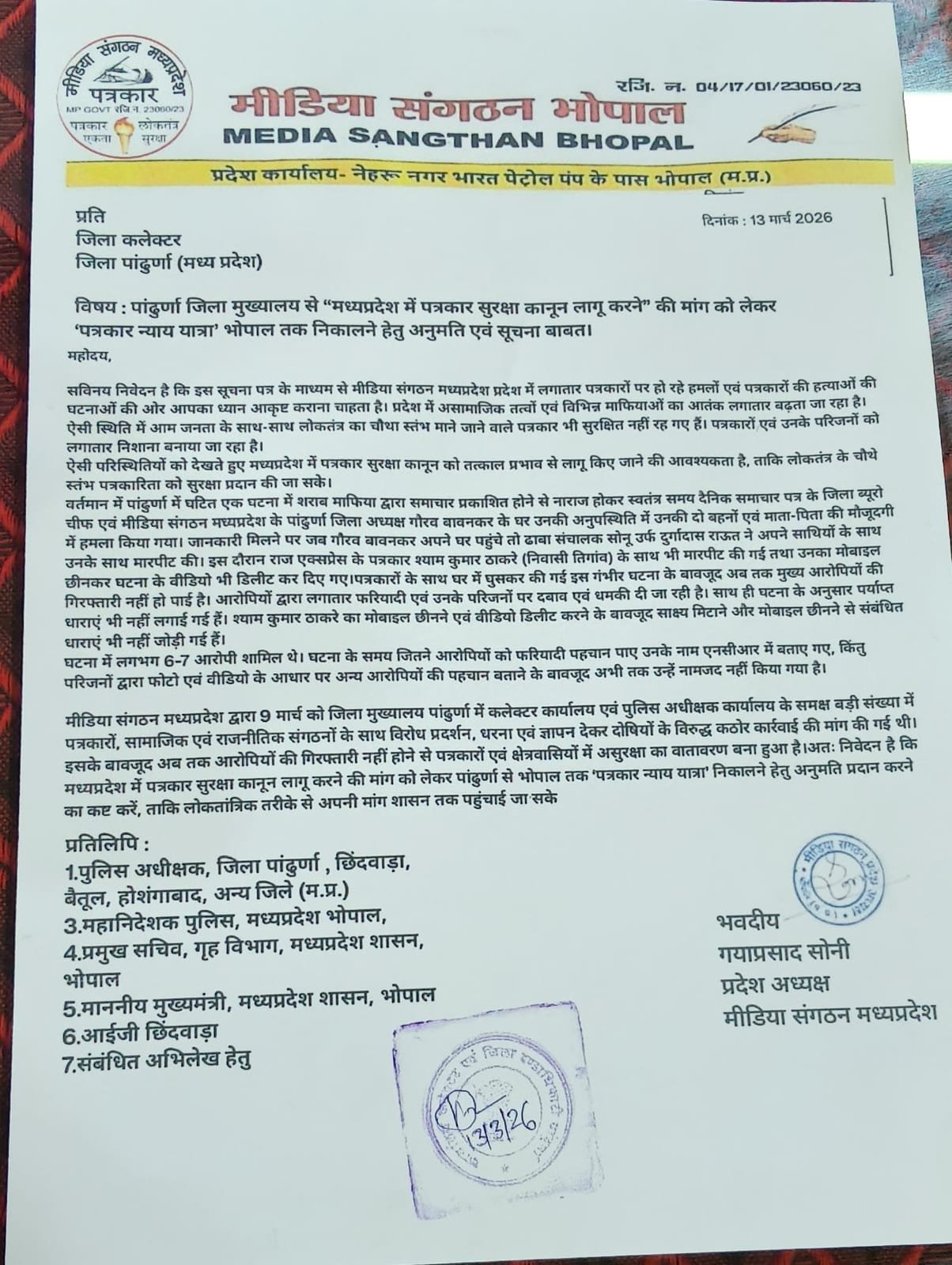 पत्रकार न्याय यात्रा जल्द से पांढुर्णा से भोपाल तक जाएगी पांढुर्णा कलेक्टर को अवगत कराया
